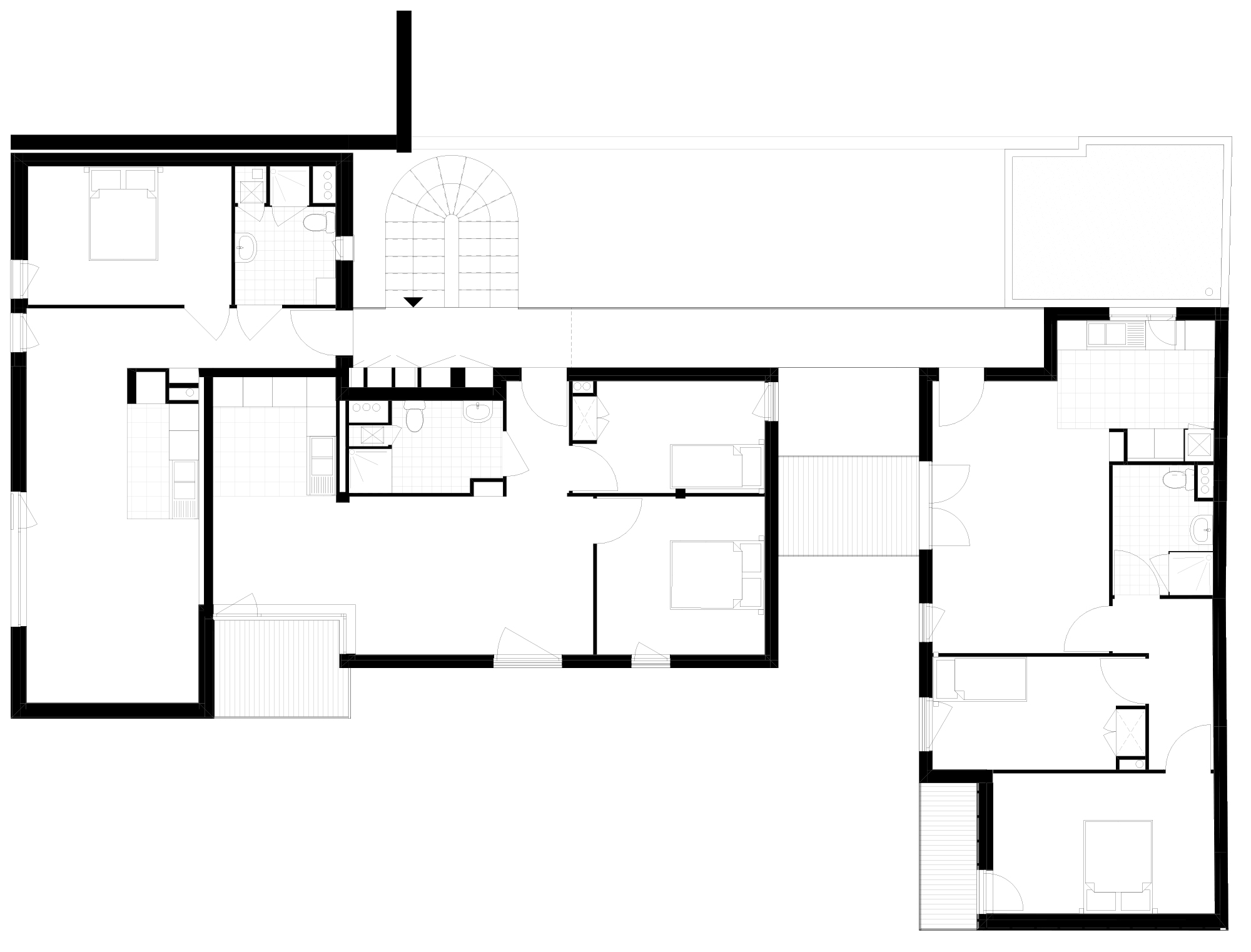 Le bâtiment d’entrée marque une transition avec les immeubles en front de rue et met en valeur le bâtiment d’angle qui vient achever ce front. Celui-ci accueille des locaux communs en rez-de-chaussée et des logements aux étages. S’élevant à près de quinze mètres et comptabilisant cinq niveaux, il est le bâtiment le plus haut et constitue l’articulation du projet. Les deux derniers étages sont aménagés en duplex avec des double-hauteurs. Moins élevés, les bâtiments en arrière permettent une transition progressive avec le tissu bâti au sud et à l’ouest du projet, dont les hauteurs varient entre un et deux niveaux au-dessus du sol. Ils sont séparés par un retrait où viennent se loger quelques terrasses qui tissent un lien entre les bâtiments tout en filtrant la lumière. On retrouve l’esprit des venelles typiques le long de la façade sud, en écho aux maisons en bandes de la venelle située sur les parcelles contiguës au sud. La séquence d’entrée permet aux habitants de pénétrer progressivement au sein des logements depuis l’espace public. Inspiré des travaux de l’architecte italien Carlo Scarpa, un bassin d’agrément en béton blanc préfabriqué est posé entre la circulation du rez-de-chaussée et l’un des murs mitoyens de la parcelle.