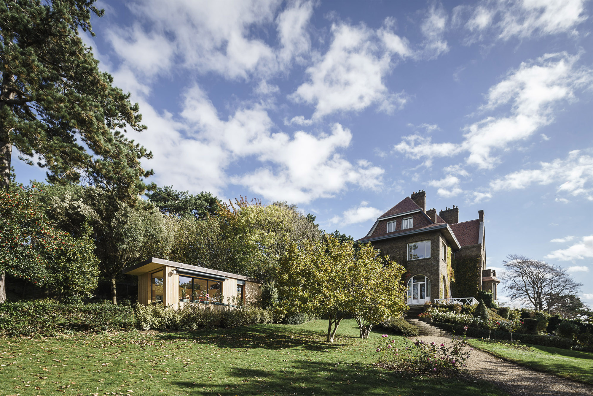 Résidants sur les hauteurs du Havre, les clients souhaitaient pouvoir accueillir leur fils prêtre aux États-Unis d’Amérique dans un lieu de repos à l’écart de leur maison, permettant la méditation et la proximité avec la nature. C’est ainsi que vint l’idée d’implanter dans le jardin paysager un cabanon permettant de jouir du panorama sur la cité d’Auguste Perret et son grand port maritime. Par son caractère exceptionnel, le jardin est en partie inscrit comme espace boisé classé. Cette composante ouvre un dialogue avec la Ville tout au long des études et guide la conception vers un projet entièrement réversible, avec un impact limité sur le sol qui l’accueille. Discrètement niché dans un écrin boisé qui l’abrite des regards, le cabanon est posé sur de petits pieux qui peuvent être vissés et dévissés en une journée sans endommager les strates végétales ni artificialiser le sol. Intimistes, les strates arbustive et arborée protègent et participent pleinement à l’espace. Le bosquet cache une douche extérieure. Le jardin est l’extension du cabanon et le cabanon est l’extension du jardin. L’inspiration a été puisé en partie dans les exemples de constructions minimalistes au service de lieux somptueux, comme les cabanes d’architecte en Patagonie. C’est un des qualificatifs que l’on peut employer pour ce jardin, l’un des plus beaux du Havre.