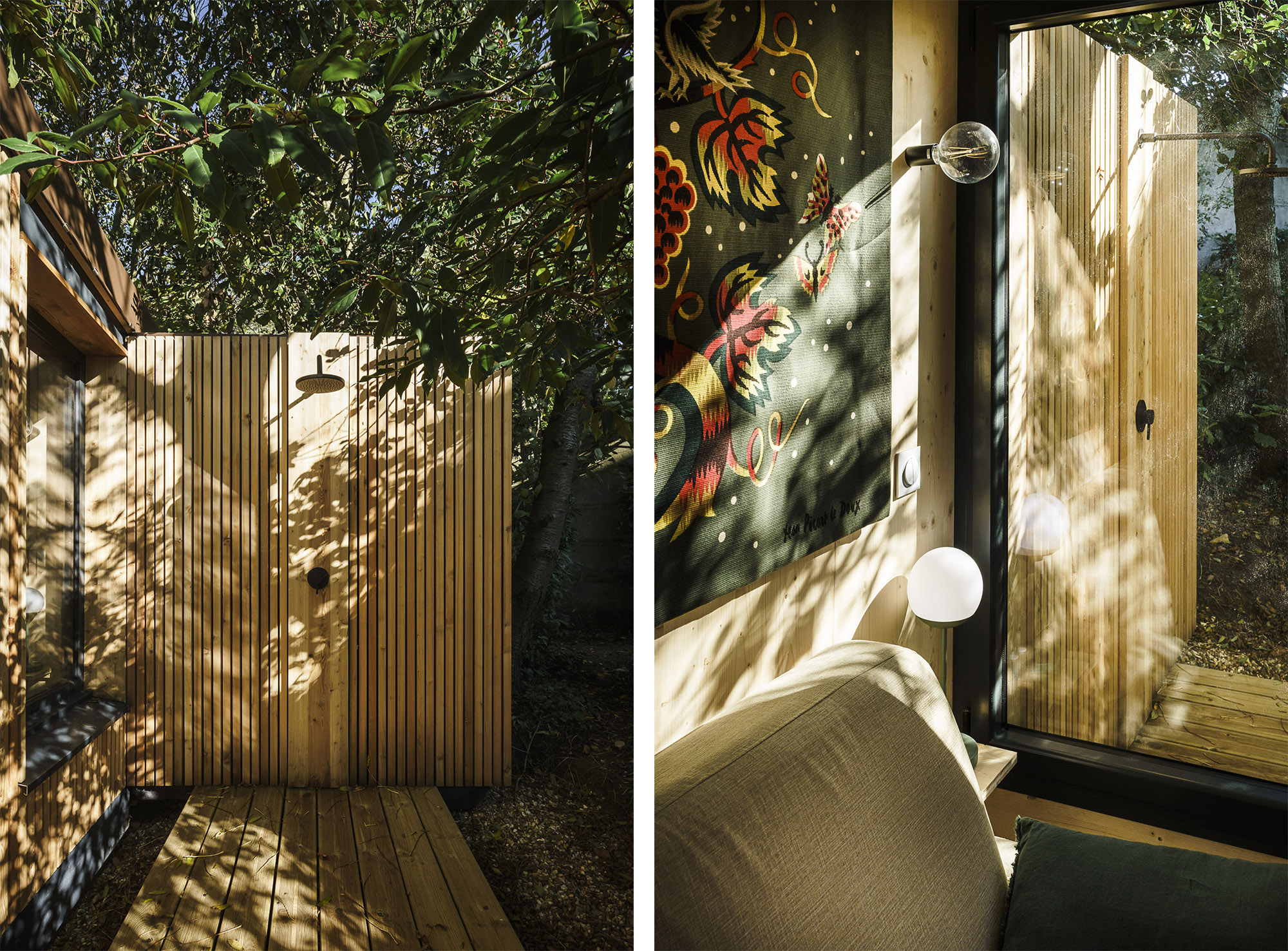 L’omniprésence du bois (Pin du Nord Blanc) à l’intérieur préserve l’ambiance de la cabane, un petit écrin entre frugalité et confort au milieu des arbres. Cet espace permet de vivre au rythme du jardin et de recevoir des amis la journée comme à la nuit tombé. Les clients ont pris pleinement part au projet en meublant avec goût l’intérieur et en associant leur jardinier. Entre abri de jardin et extension, le cabanon pourra à l’avenir être démonté, transporté et réassemblé sur un autre site.